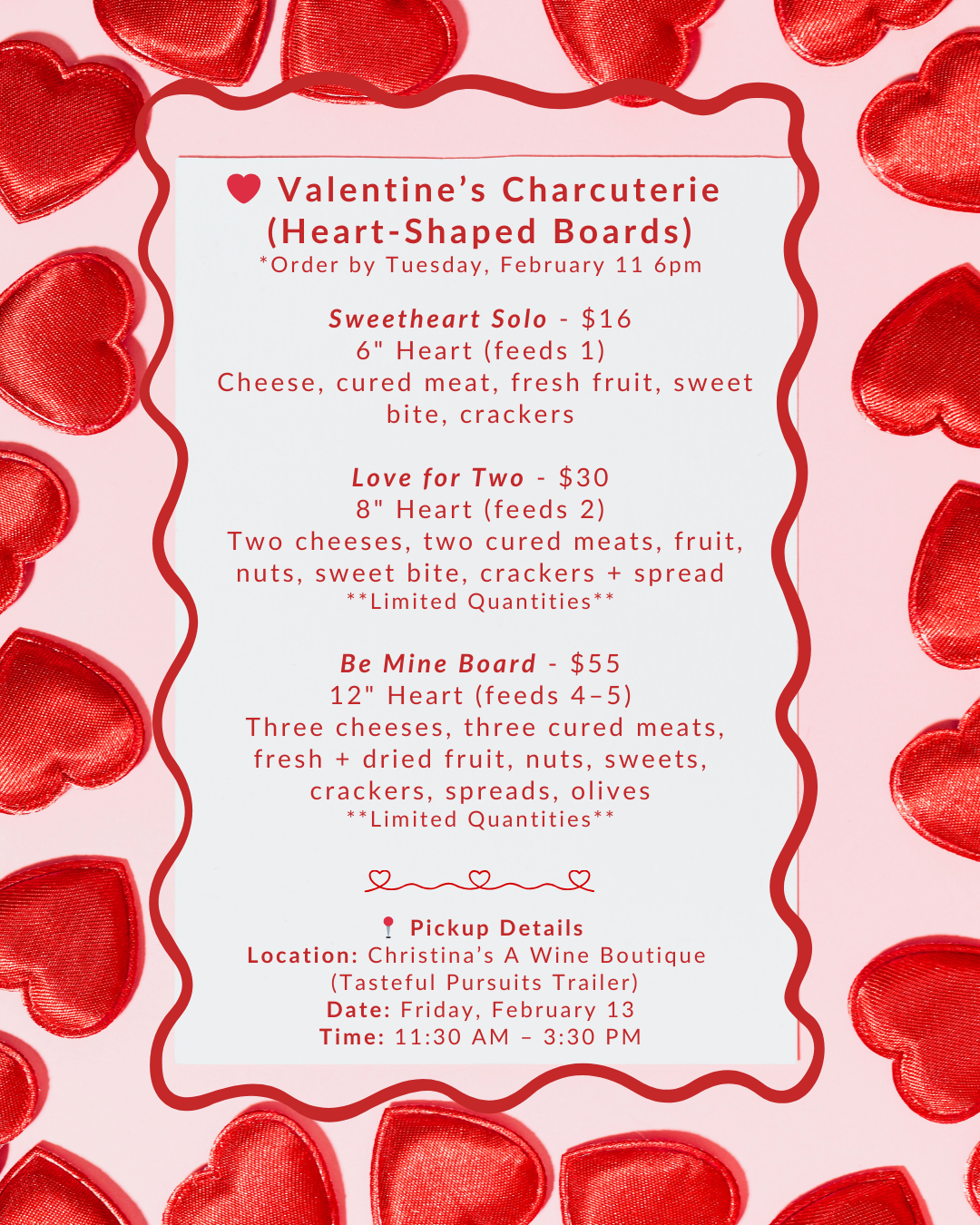 Celebrate Valentine’s Day with thoughtfully crafted treats, baked and curated in small batches. From cupcakes and treat boxes to heart-shaped charcuterie and mini cakes, each item is made with care and designed for sharing (or savoring yourself).